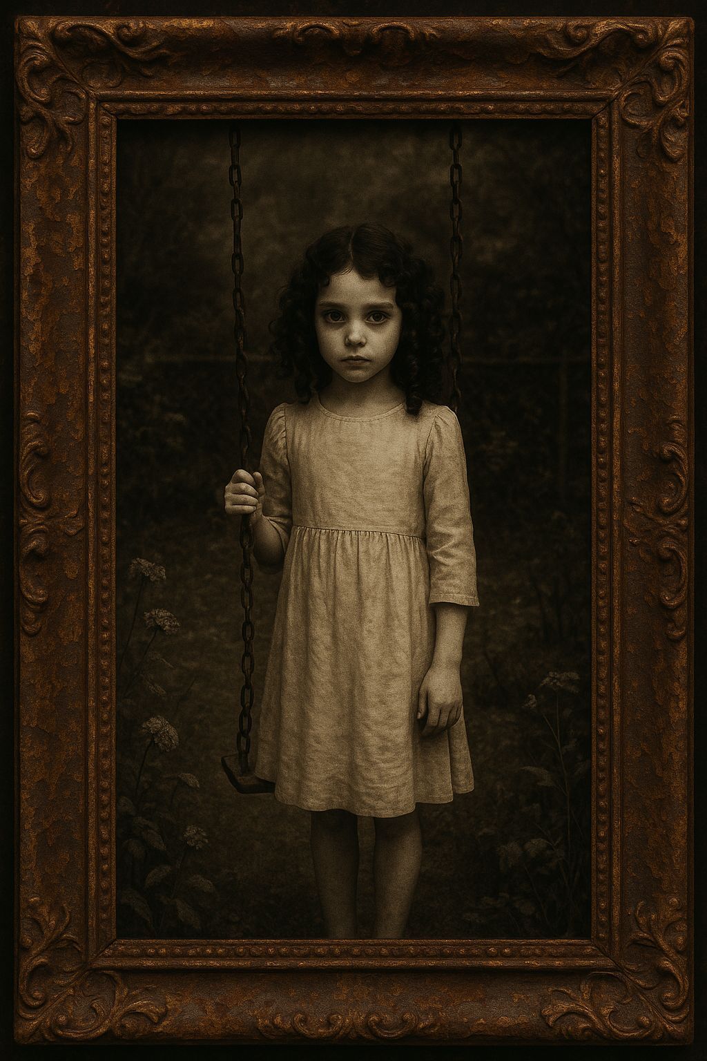 The girl in the photo on her wall blinked. Ava froze mid-step, sloshing tea across the carpet. Her eyes locked on the frame. The image looked the same: rusted gold trim, a colourful yet faded garden, a swing dangling from nowhere. And the girl, maybe eight, with porcelain skin, green eyes, a dirty pinkish-red dress, and corkscrew curls.
